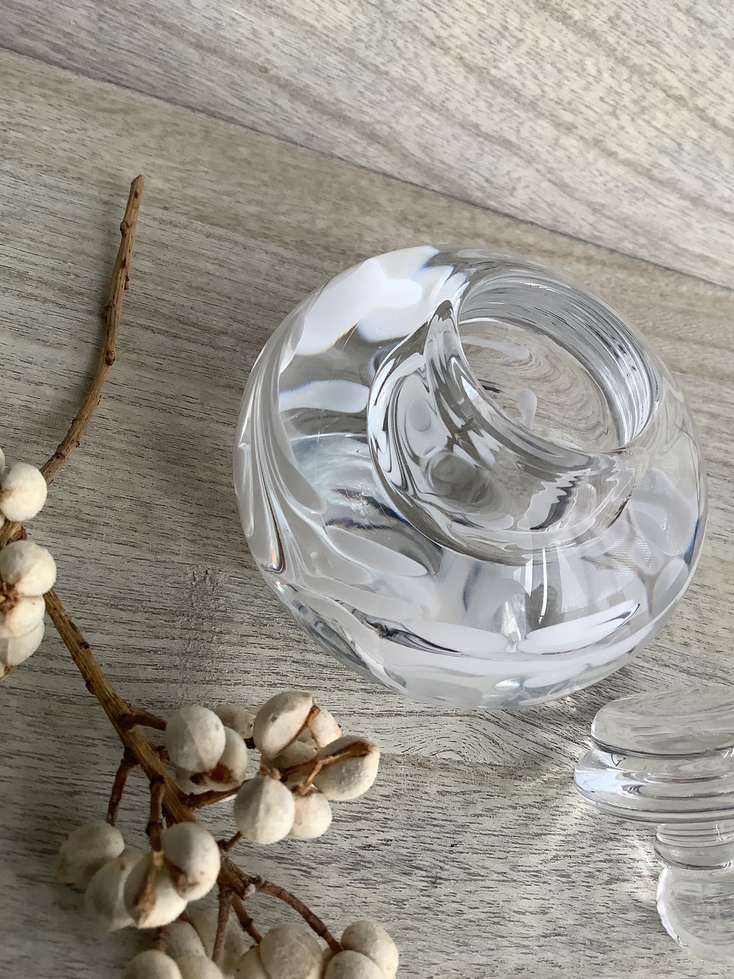 手のひらサイズで、ガラスの厚みの見え方を堪能できる蓋物です。